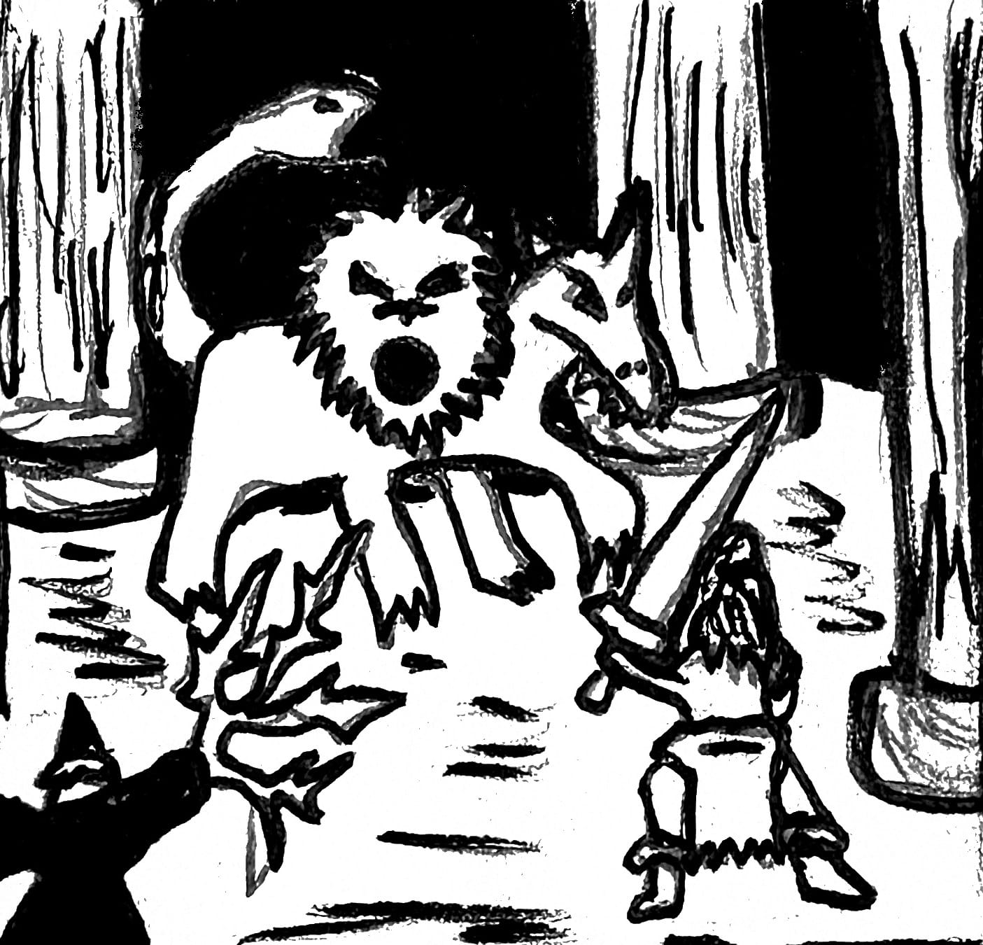 Pressed on all sides, the predator seemed to realize it had become the prey, and began to retreat from the bout. It backed into one of the hall’s giant pillars. Nanoc, Lem, and Swipe now stood before it in a row, bleeding from shallow wounds earned in the melee, but strong and resolute. The chimaera’s fur puffed up like a cornered cat’s and its dragon-head reared back with a reptilian screech.